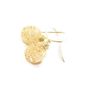 Each earring features a sparkling 12mm champagne druzy quartz cut into a stunning circular silhouette, wire wrapped by hand in a 14k gold filled wire. Due to the nature of this exquisite stone, no two pairs of earrings will be exactly alike, adding a charming aesthetic. Both earrings are finished off with luxurious French hooks.