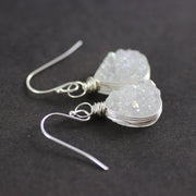 These earrings feature beautiful white druzy quartz teardrop beads that have been wire wrapped in sterling silver wire and hang from sterling french hook ear wires.