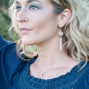 The contrast of the textured face of these druzy stones compliments the smooth, circular cut perfectly. Each handmade earring is finished off with sterling silver wire wrapped settings and French hooks. The tassel sterling silver accents give these pieces their statement length of approximately 3 inches.