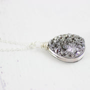 This necklace features a beautiful silver druzy quartz teardrop bead that has been wire wrapped in sterling silver wire. It hangs from delicate sterling cable chain and has been finished with a spring clasp.