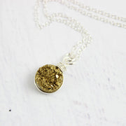 This tiny and understated necklace features a small dark gold druzy quartz circle bead that hangs from delicate and lightweight sterling silver cable chain. It has been finished with a spring clasp.