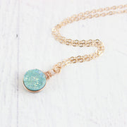 Tiny and petite light green druzy rose gold circle necklace. Colors inspired from the ocean make this necklace soothing and exotic. A 10 mm light green colored druzy quartz gemstone suspended from a 14kt rose gold-filled chain. 14kt rose gold-filled thin wire adds charm to the bead and secures it to the chain with a spring clasp. Round cut design with a minimalistic yet stunning design that gives you a trendy and sophisticated look. Available in 16 inch and 18 inch chain lengths.