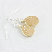These earrings feature beautiful peach champagne druzy quartz teardrop beads that have been wire wrapped in sterling silver wire and hang from sterling french hook ear wires.