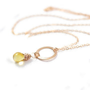 This necklace features a yellow citrine teardrop gemstone that has been wire wrapped in 14k rose gold filled wire and hangs from a rose gold circle pendant. It is finished with lightweight and delicate rose gold cable chain and a spring clasp closure.